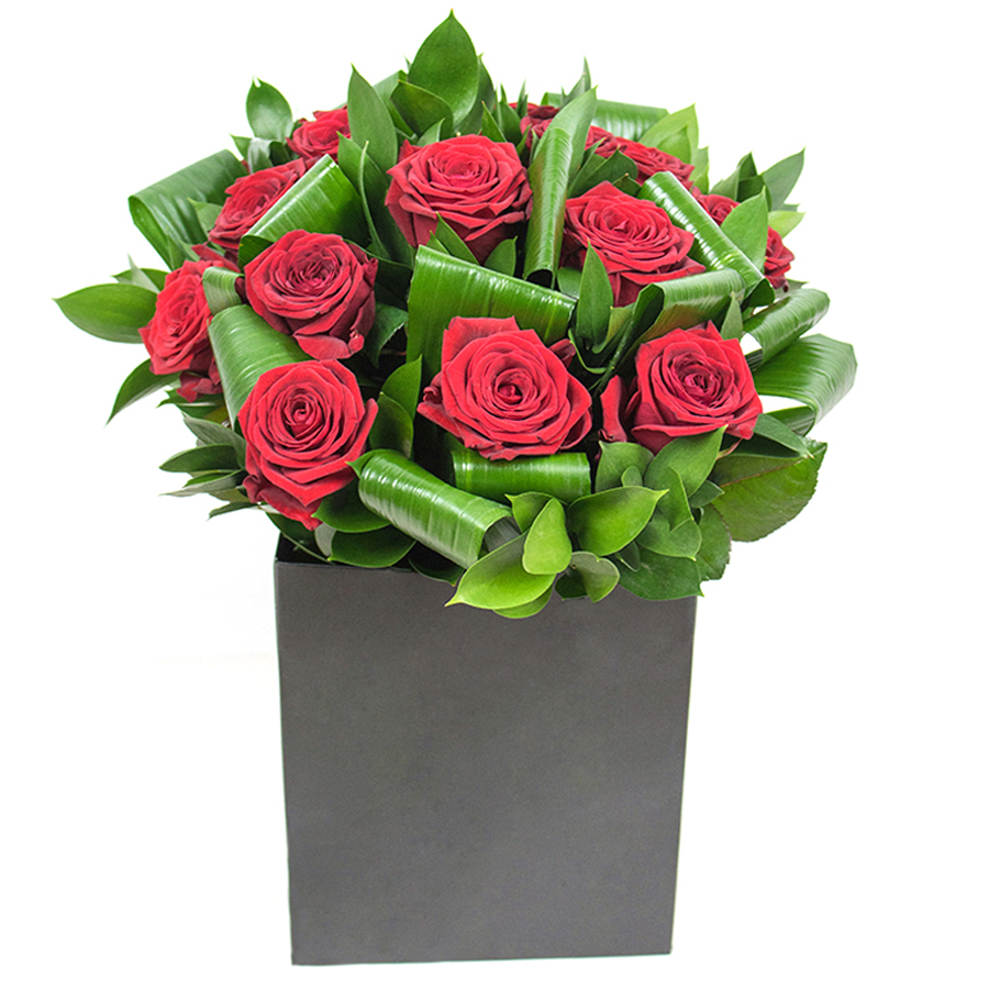 Our stunning arrangement is a celebration of nature’s finest with deep red roses, elegant aspidistra leaves, and stylish ruscus. Crafted with love and precision, every element of this bouquet is hand-selected to ensure premium quality and long-lasting freshness.